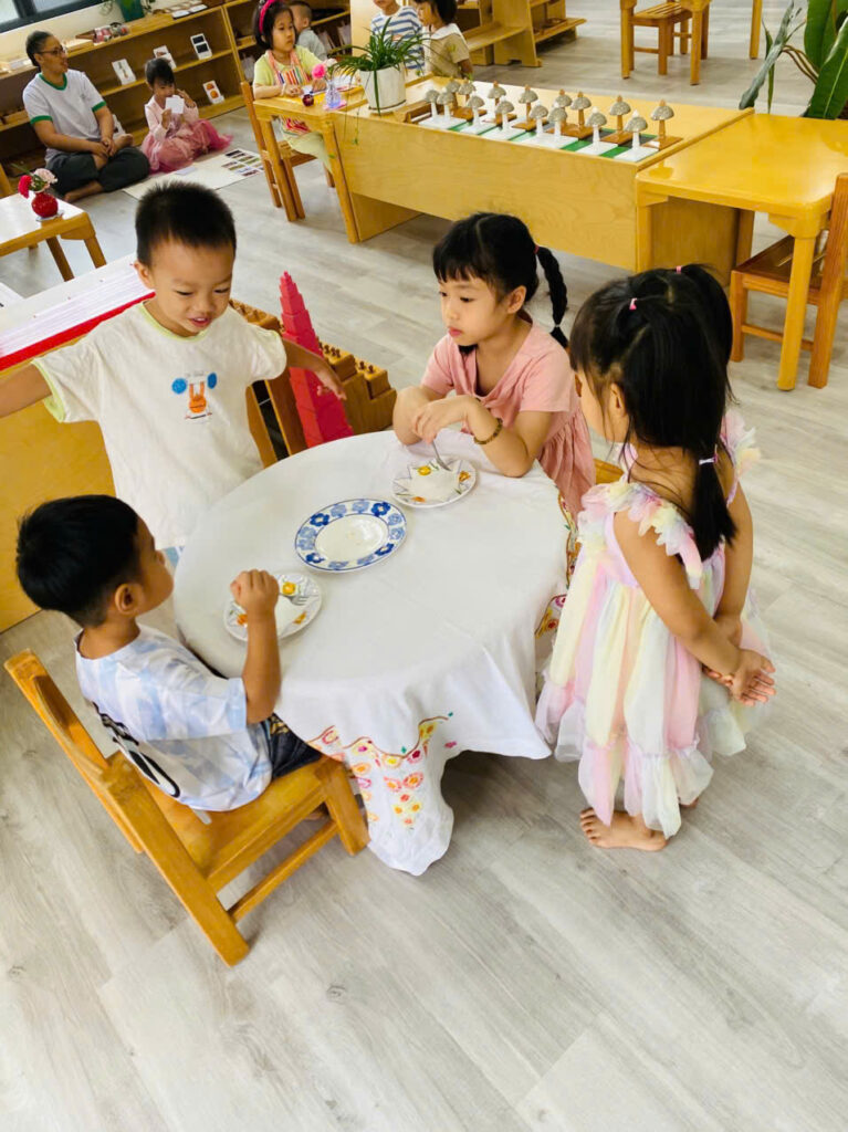 Trong quá trình giảng dạy, giáo viên Montessori luôn tạo điều kiện để các con được nói, được giao lưu và học hỏi. Cô có thể mời trẻ chia sẻ về một ngày học tập của con, về hoạt động mà con có hứng thú,…luôn tìm cách gợi mở để trẻ mạnh dạn trao đổi. Ngoài ra, các hoạt động làm việc nhóm sẽ giúp trẻ tương tác với các bạn khác, trao đồi khả năng giao tiếp và xử lý tình huống.